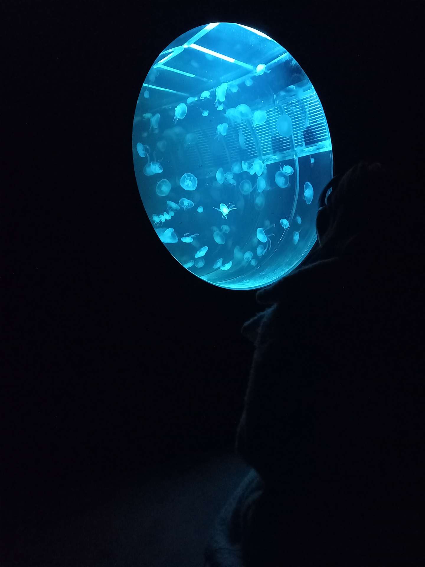 In einem abgedunkelten Raum schwimmen Quallen in leuchtend blauem Wasser. Besucherinnen und Besucher sitzen wie hypnotisiert von dem Guckloch. Sie tragen Kopfhörer: „Quallen sind die Letzten, die noch übrig sein werden, wenn alles andere zerfällt“, erfahren sie in russischer und englischer Sprache.