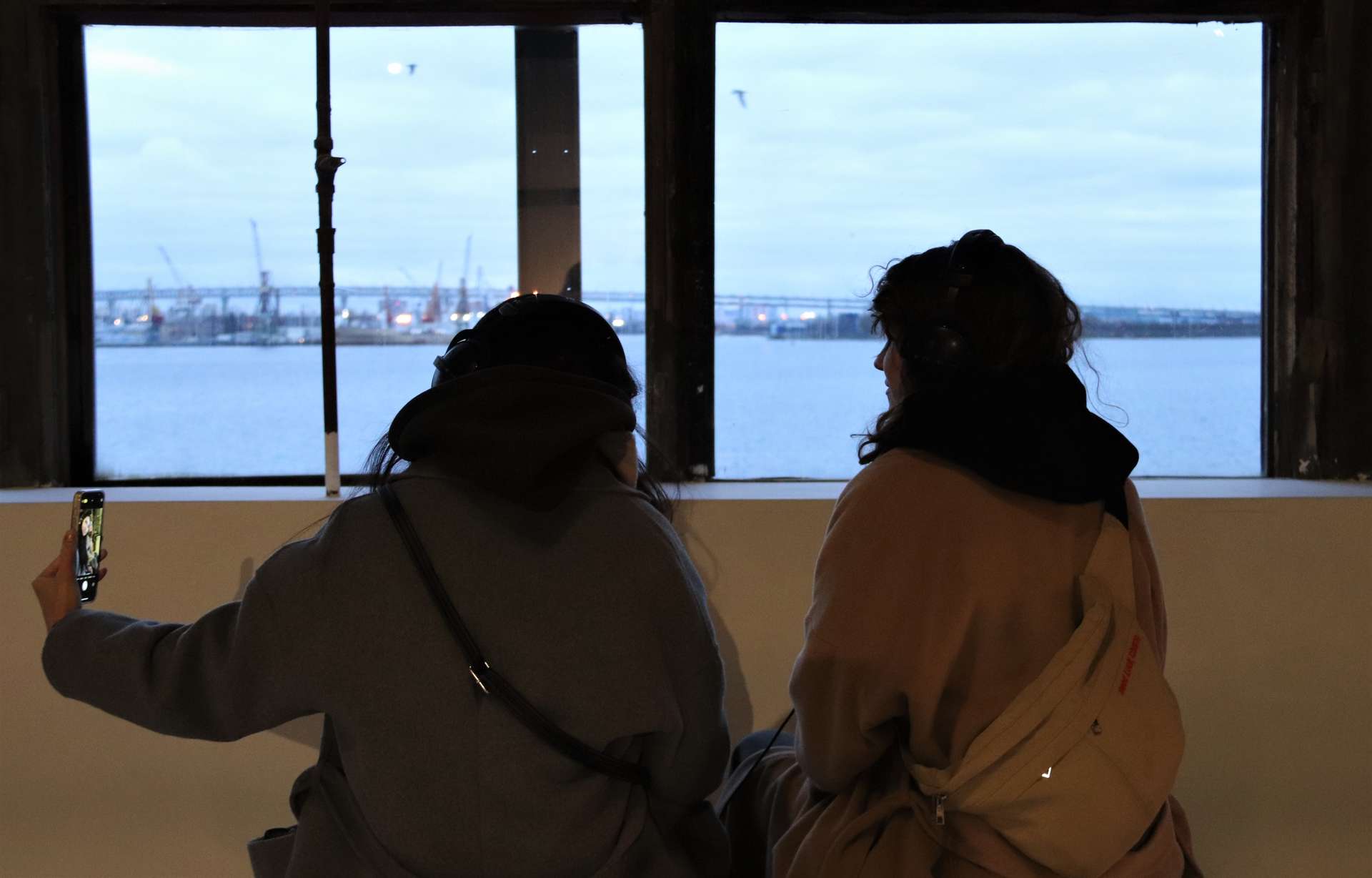 Atmosphärische Klänge wabern aus einer der Hallen. Das Meer rauscht, Muscheln singen. Geräusche der See bäumen sich auf. Grüne Stahlträger zerschneiden die zugige, fast leere Fläche im Untergeschoss. Sie stützen das obere Stockwerk, aus dem die Soundinstallation hinunterhallt.