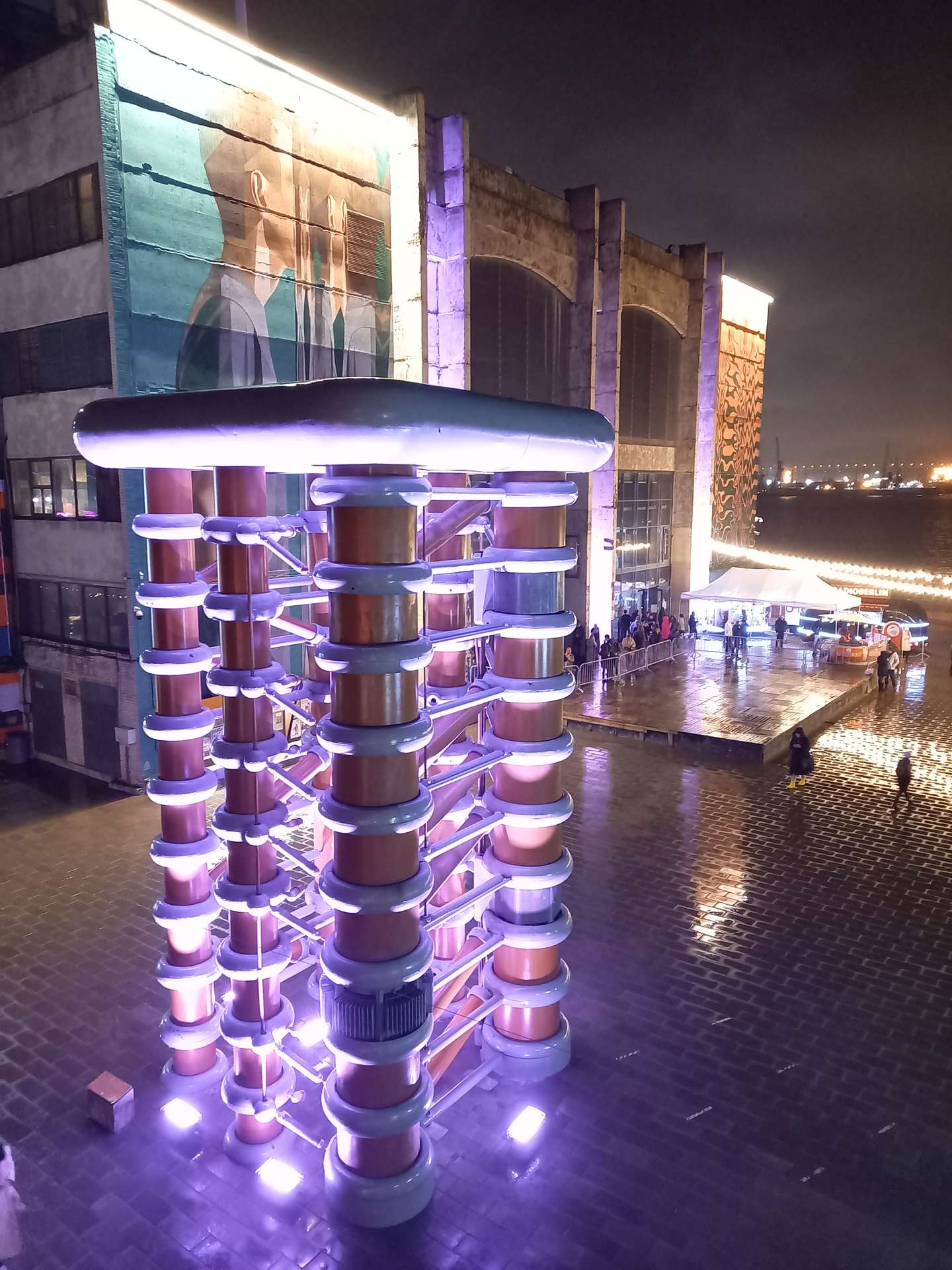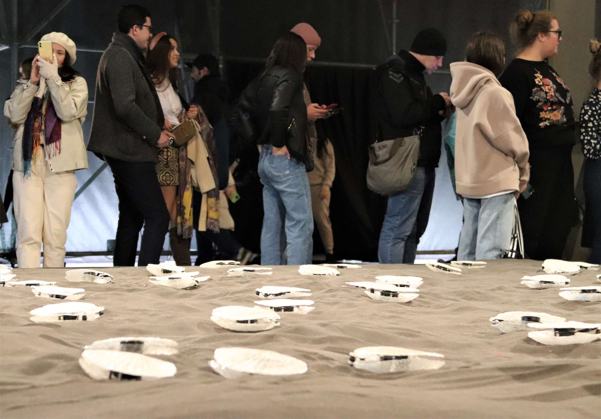 Internationale Künstlerinnen und Künstler widmen sich in ihrer Medienkunst dem Klima und der Umwelt. Eine Armada aus Muscheln aus recyceltem Plastik bildet einen Chor: Der italienische Künstler Marco Barotti wandelt Daten von Sensoren, die Wasserqualität messen, in Töne um. In Echtzeit vertont er die Wasserqualität der Großen Newa, da draußen vor dem Hallentor. Die Plastikmuscheln singen.