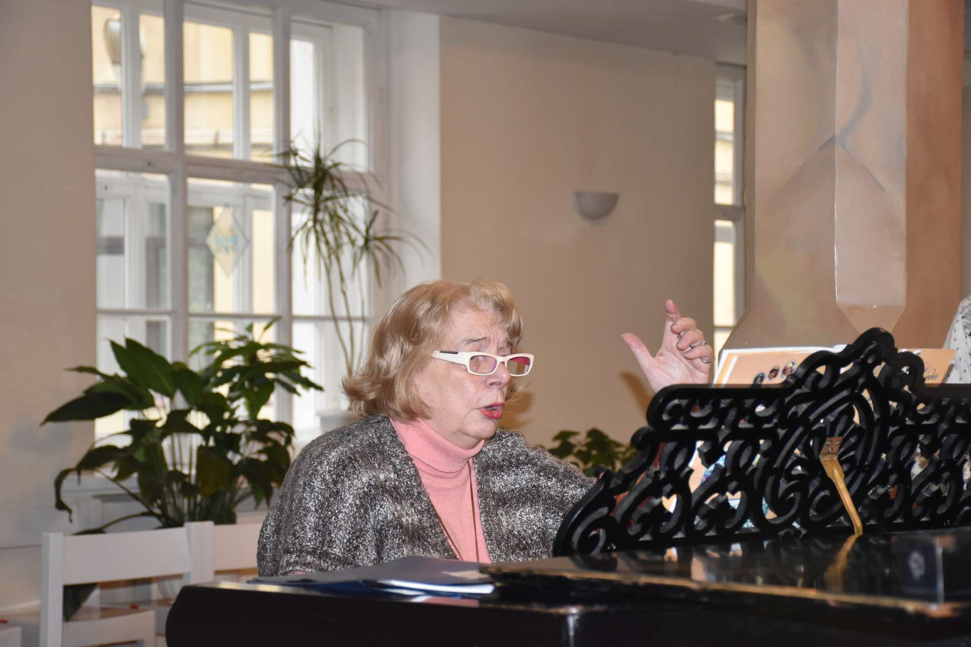 Natalia Uralskaia, eine ältere Frau mit aschblond gefärbtem Haar sitzt wie die Kapitänin eines Schiffs an einem schwarzen Flügel. Am Ende des Instruments wärmen drei Frauen ihre Stimmen zu Uralskaias Tonleiterspiel auf.
